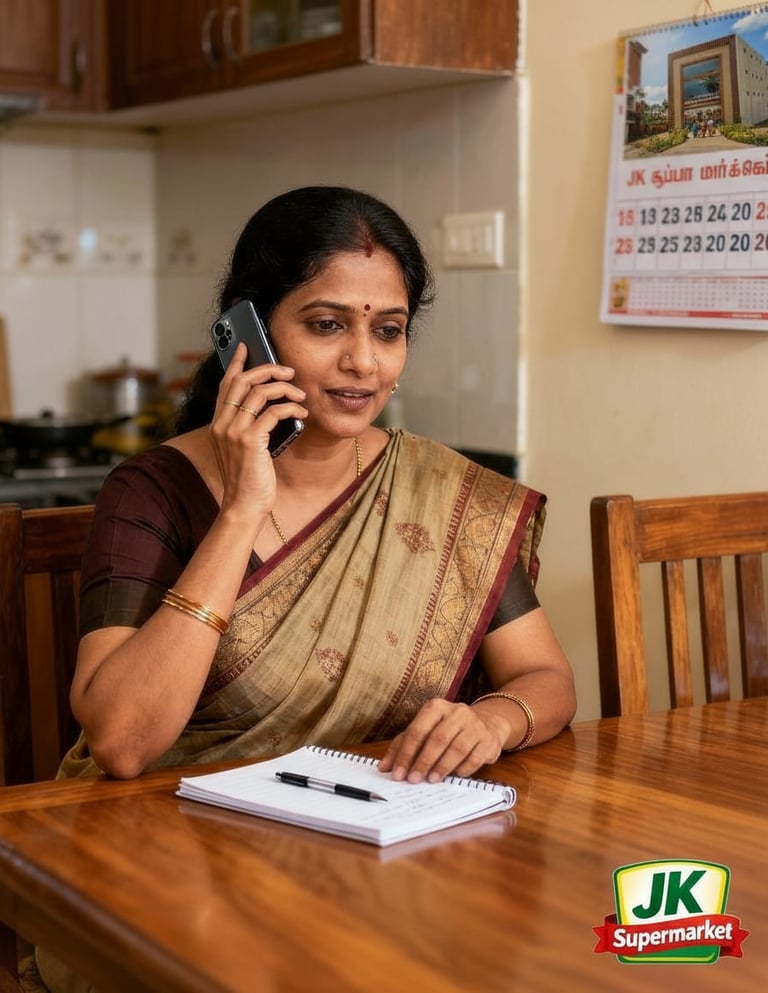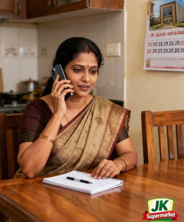 உங்கள் கைபேசி மற்றும் WhatsApp மூலம் JK Supermarket-ஐ தொடர்பு கொண்டு, உங்களுக்குத் தேவையான அனைத்து பொருட்களையும் எளிதாக ஆர்டர் செய்யலாம்.