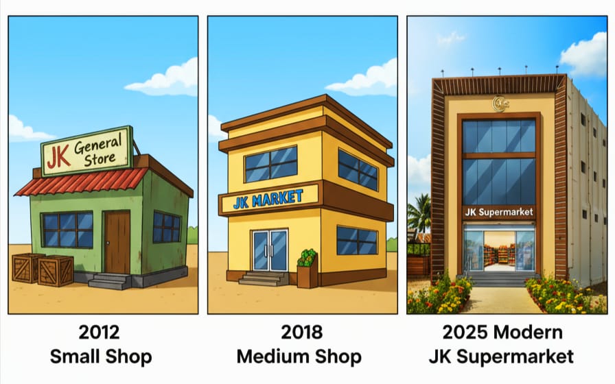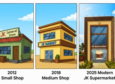 எங்கள் நிறுவனத்தின் தொடக்க வருடம் 2012 ஆம் ஆண்டு, ஒரு சிறிய 800 சதுரடி அறையில் தொடங்கியது எங்கள் கனவு... எங்கள் JK ஸ்டோர்! அந்த சிறிய இடத்தில் இருந்த போதும், தரமே எங்கள் வாழ்வும் இலக்குமாக அமையச் செய்தோம். 2018 ஆண்டு எங்கள் நிறுவனத்தை விரிவுபடுத்த சின்னமனூர் நகருக்கு வந்து 1200 சதுர அடி பரப்பில், பின்னர் முறையாக திட்டமிட்டு வளர்ச்சி செய்து, இன்று 15,000 சதுர அடியில் ஜேகே சூப்பர் மார்க்கெட் பரந்து விரிந்துள்ளது.இந்தப் பயணம் எளிதல்ல. குறிப்பாக கொரோனா காலத்தில் பல தடைகள் வந்தன. ஆனாலும், வாடிக்கையாளர்களின் நம்பிக்கையும், எங்கள் தரமான பொருட்கள் வழங்கும் உறுதியும் தான் எங்களுக்கு இன்றைய நிலையைச் அடையச் செய்தது. எப்போதும் தரத்தை குறைக்காமல், விலையை நிலைநாட்டி, கடின உழைப்பில் தொடர்ந்து இருந்தோம். அதன் பலனாக இன்று உலக தரங்களுக்கான ISO சான்றிதழ் எங்கள் நிறுவனத்திற்கு கிடைத்தது. இது எங்கள் நிறுவத்தின் தரத்தையும் நம்பிக்கையையும் உறுதி செய்யும் பெரும் சாதனையாகும். இது வெறும் வெற்றி அல்ல, எனது வாடிக்கையாளர்களின் மகத்தான ஆதரவின் பலனாகும்.நம்பிக்கை, தரம், மற்றும் எங்கள் வாடிக்கையாளர்கள் தங்கள் நிறுவனம் போல் கருதி எங்கள் குறை நிறைகளை அவ்வப்போது எடுத்துரைத்து எங்களுக்கு இன்று வரை ஆதரவளித்துக் கொண்டிருக்கிறார்கள் , உங்கள் அன்பும் ஆதரவுடன், JK சூப்பர் மார்க்கெட் தொடர்ந்து வளர்ந்து, சிறந்த சேவையை வழங்கத் தொடரும்!